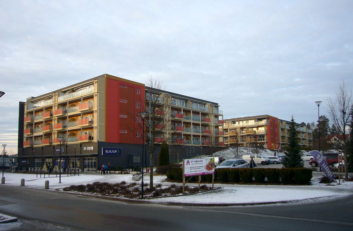 Modulbasert boligbebyggelse plassert på taket av et stort forretningslokale med garasjeanlegg i underetasjen. Boliger av tre med stål som bærende konstruksjoner i balkonger og svalganger.